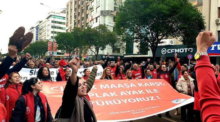 Devrimci İşçi Sendikaları Konfederasyonu’na (DİSK) bağlı Genel Hizmet İşçileri Sendikası (Genel-İş) üyesi İzmir Büyükşehir Belediyesi işçileri, ek ödemelerin yapılmamasını protesto etmek amacıyla yarım günlük iş bırakma eylemi gerçekleştirdi. Sendika binası önünde toplanan işçiler, çıplak ayaklarla yürüyerek Kültürpark 9 Eylül Kapısı’na ulaştı. “Şirkete iadeler ve işten çıkarmalara son, artık yeter” pankartının taşındığı yürüyüşte, “Birleşen işçiler asla yenilmez”, “Kurtuluş yok tek başına, ya hep beraber ya hiçbirimiz” ve “Hakkımız olanı istiyoruz” sloganları atıldı. Genel-İş İzmir 1, 2, 3 ve 9 No’lu Şube temsilcileri de açıklamaya katıldı.