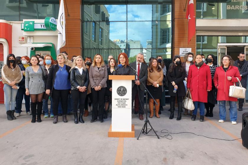 Açıklama öncesi konuşan İzmir Barosu Başkanı Özkan Yücel, “Kendi ülkesinde kendi kanunlarını tanımayan devlet büyüklerinin ülkesinde yaşıyoruz. Kanunlara uyumamaya teşvik eden sorumlular ve bunlar hakkında harekete geçmeyen yargı mensupları” diyerek Erdoğan’ın sözlerini eleştirdi.