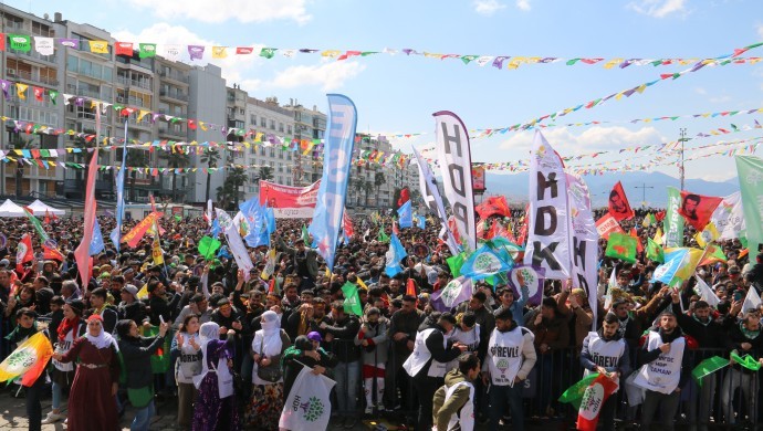 İzmir’de “Dem, dema serkeftinê ye (Şimdi, kazanma zamanı)” şiarıyla düzenlenen Newroz coşkuyla kutlanıyor. İzmirliler, sabahın erken saatlerinde Gündoğdu Meydanı’na giriş yapmak için iki farklı giriş noktasının önünde toplandı. Kitle, alana saat 13.00’da Cumhuriyet Meydanı ve Alsancak yönünde meydana giriş yaptı. Siyasi parti ve sendikalar, açtıkları pankart ve dövizlerle kortej halinde meydana giriş yaptı. Kadınlar ve gençlerin yöresel kıyafetleriyle katıldığı Newroz kutlaması, renkli görüntülere neden oldu.