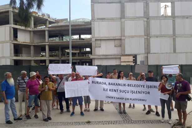 İnşaat önünde toplanan İzmir’e Sahip Çık Platformu bileşenleri, yaşanan hukuksuzluğa dikkat çekmek amacıyla “Burada kent suçu işleniyor” yazılı pankart açtı.