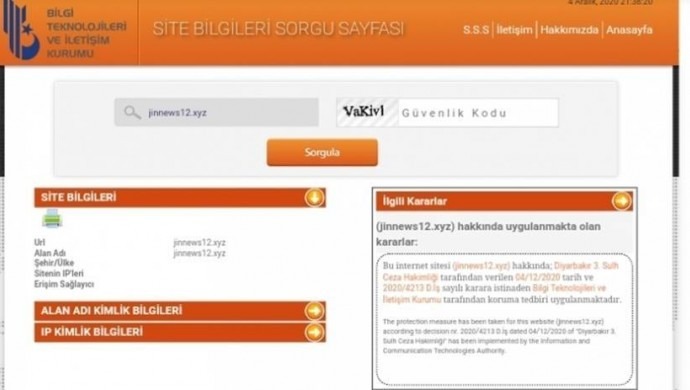 Diyarbakır 3’üncü Sulh Ceza Hakimliği’nin kararı ile siteye getirilen erişim engeline dair BTK’den şu açıklama yapıldı: “Bu internet sitesi (jinnews12.xyz) hakkında; Diyarbakır 3. Sulh Ceza Hakimliği tarafından verilen 04/12/2020 tarih ve 2020/4213 D.İş sayılı karara istinaden Bilgi Teknolojileri ve İletişim Kurumu tarafından koruma tedbiri uygulanmaktadır.”