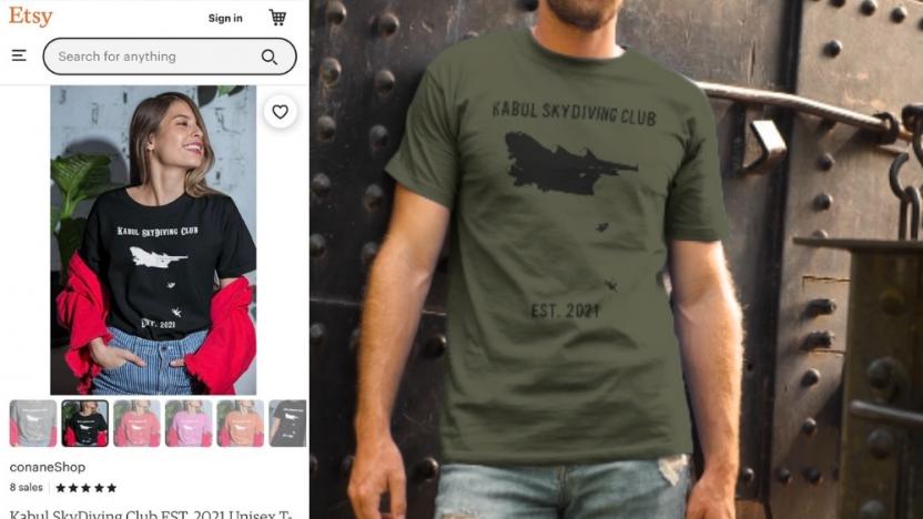 ABD menşeli alışveriş platformu Etsy üzerinden Kabil’den kalkışı sırasında en az 7 kişinin yaşamını yitirdiği ABD kargo uçağının resminin olduğu kıyafet satışa sunuldu.
