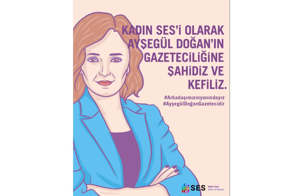 “Biz, Kadın SES’i elçileri olarak Ayşegül Doğan’ın gazeteciliğine şahidiz ve kefiliz. Çünkü; Dünyanın hiçbir yerinde bir kişinin, hükümetin verdiği basın kartına göre gazeteci olup olmadığına karar verilemez. Doğan, iddia edildiği gibi Demokratik Toplum Kongresi (DTK) üyesi olmadığını ve ortam dinlemelerinin kendisine ait olmadığını ispatladı. IMC TV’de çalışırken usülsüz bir biçimde dinlendiği, takip edildiği anlaşılan Ayşegül Doğan’a, nedense yıllar sonra (2018) dava açıldı. Doğan, mesleği gereği yaptığı konuşmalar, katıldığı konferanslar ve söyleşiler üzerinden “terör örgütü kurmak”la suçlandı. Yani tüm suçlamalar, gazetecilik faaliyetleri üzerinden yapıldı!