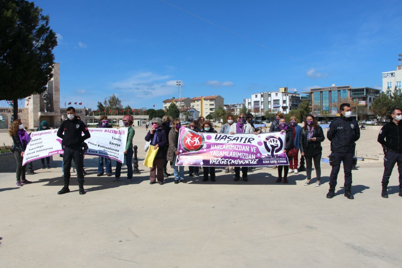Aydın’da Didim Kadın Platformu ise İstanbul Sözleşmesi’nden çekilme kararına karşı Dikili Kent Meydanı’nda oturma eylemi yapmak istedi. Yazılı başvuru yapılmadığı gerekçesiyle polisler kadınların oturma eylemi yapmasına izin verilmedi. Duruma tepki gösteren kadınlar meydanda yürüyerek, “İstanbul Sözleşmesi’nden vazgeçmiyoruz” dedi. Yapılan yürüyüş ardından açıklamayı Didim Kadın Platformu adına Gülçin Göz Akın yaptı.