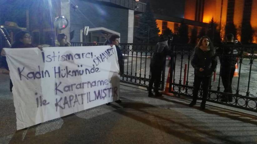 Diyanet’in internet sitesinden nikah tanımına yapılan açıklamada çocuklara cinsel saldırıyı teşvik eden söylemler kullanılmıştı. Halkevci Kadınlardan oluşan bir grup, başkanlık önünde “Diyanet elini hayatımdan çek” sloganı atarak, “İstismarcı Diyanet, Kadın Hükmünde Kararname ile mühürlenmiştir” pankartı açtı. Dün gece saatlerinde yapılan eylemde 6 kadın gözaltına alındı.