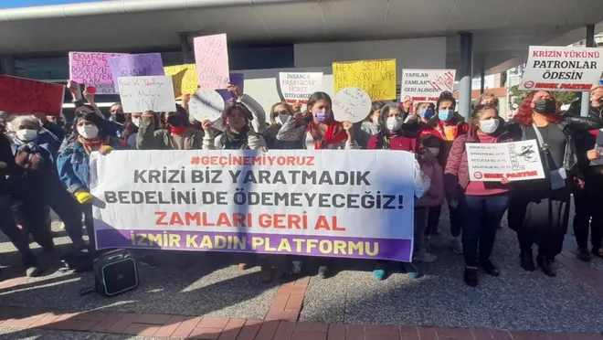 İzmir Kadın Platformu, gelen zamlara karşı “Geçinemiyoruz. Krizi biz yaratmadık, bedelini de ödemeyeceğiz” diyerek basın açıklaması yaptı.