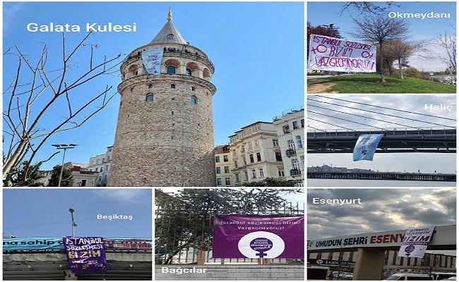 İstanbul Sözleşmesi’nin 20 Mart gecesi AKP’li Cumhurbaşkanı Tayyip Erdoğan’ın imzasıyla feshedilmesinin ardından kadınlar eylemlerini sürdürüyor. İstanbul Sözleşmesi’ni Uygula Kampanya Grubu, İstanbul’un birçok ilçesinde “İstanbul Sözleşmesi bizim! Vazgeçmiyoruz” yazılı pankartlar astı.