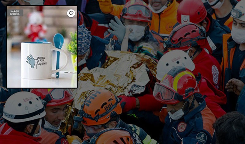 Elif’in kurtarma ekibinin elini tuttuğu fotoğraf, bardak baskısı olarak kullanılarak online alışveriş sitesi Trendyol’da ‘hediyehanem’ isimli bir mağaza tarafından satışa sunuldu.