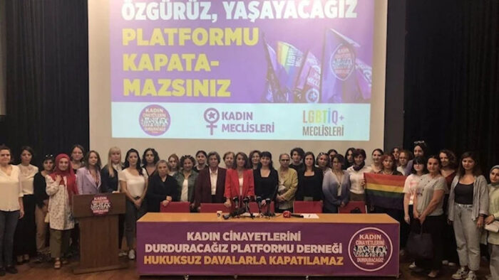 Kadın Cinayetlerini Durduracağız Platformu hakkında açılan kapatma davasının 2. duruşmasına ilişkin Şişli Nazım Hikmet Kültür ve Sanat Evi Abidin Dino Salonunda basın toplantısı düzenledi.