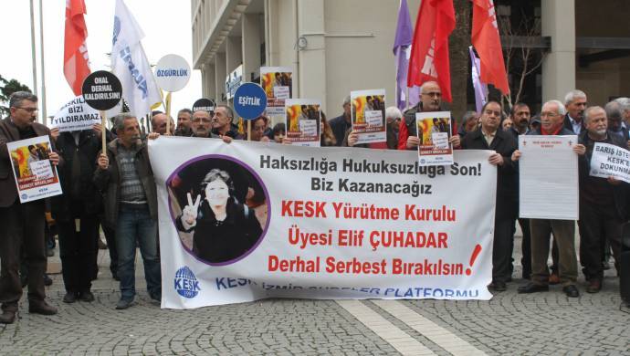 Basın açıklamasını okuyan Tarım Orkam-Sen İzmir Şube Başkanı Çağdaş Topal, savcılıklar ve kolluk kuvvetlerinin operasyon yapmak için artık arşivleri taradığını söyledi Topal, geçmişin OHAL hukukuyla yargılandığını ifade etti. Çuhadar’ın sendikal hak ve özgürlükler kapsamında yürüttüğü faaliyetler nedeniyle yargılanamayacağını belirten Topal, “Barış isteyen KESK yargılanamaz, demokrasi isteyen KESK yargılanamaz. Elif arkadaşımız onurumuzdur. Derhal serbest bırakılmalı, hukuksuz gözaltılara son verilmelidir” dedi.