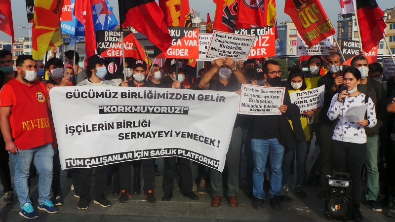Vakalar yükselip ölüm oranları artarken kapitalistlerin, süreci fırsata çevirerek yıllardır düşledikleri saldırıları hayata geçirmeye çalıştığını belirten Bozkurt, “Çalışma Bakanlığı son olarak duyurduğu ‘Yeni Sürüm İstihdam Paketi’ ile bu ısrardan vazgeçmeyeceklerini de gösterdi. Zehra Zümrüt Selçuk’un özellikle gençler ve kadınlar üzerinden ‘müjde’sini verdiği pakete göre ‘yarı zamanlı çalışma’, ‘kısmi çalışma’ ve ‘uzaktan çalışma’ önümüzdeki sürecin temel istihdam biçimi olarak tanımlanıyor. Son torba yasada 25 yaş altı 50 yaş üstü için belirli süreli iş sözleşmelerinin koşul aranmadan tekrarlanması AKP’li milletvekillerinin oylarıyla kabul edildi” dedi.