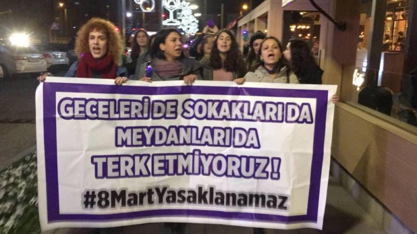 “Geceleri de sokakları da meydanları da terk etmiyoruz. 8 Mart yasaklanamaz” yazılı pankartla Yahya Kaptan Mahallesi’nde sloganlar eşliğinde yürüyüş gerçekleştiren kadınlar, “Her gün onlarca kadının öldürüldüğü, tacize, tecavüze uğradığı bu kentte vali iki senedir kadınların 8 Martlarını, 25 Kasımlarını yasaklamaya çalışıyor. Biz kadınlar bu kentte olduğumuz sürece ne valinin yasaklarını tanırız, ne de ona boyun eğeriz” dedi.