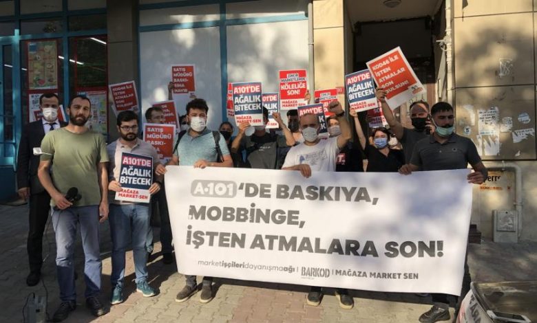 Basın açıklamasını okuyan A101 işçisi ise “Baskıya mobbinge daha fazla katlanmak istemeyen arkadaşımız haklarını alıp işten ayrılmak isterken işyeri tarafından Kod46 ile hiçbir hakkı verilmeden işten atıldı. Yaklaşık bir buçuk yıldır süren salgın günlerinde tanımlı iş saatlerinden daha fazla çalışmak zorunda bırakılarak bu baskılara maruz kaldık. Bizler A101 çalışanları olarak işten atılan arkadaşımızın tüm hakları verilip tekrar işine dönene kadar, satış müdürü Hidayet Tolga Akdoğan görevinden alınana kadar buradayız. Haklarımız için sonuna kadar mücadele edeceğiz” ifadelerini kullandı.
