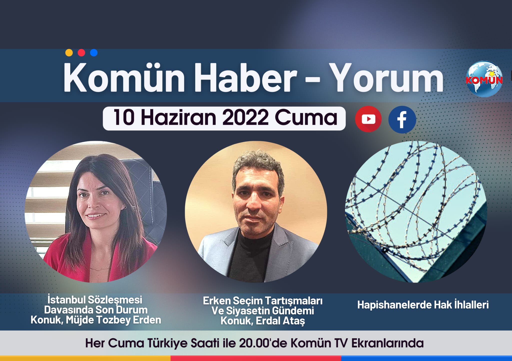 Her hafta cuma günleri Komün TV’de yayınlanan Komün Haber-Yorum’da hafta boyunca öne çıkan gelişmeler ele alınacak. Programa bu hafta “İstanbul Sözleşmesi’ndeki Son Durumu” değerlendirmek için Avukat Müjde Tozbey Erden, “Erken Seçim Tartışmaları ve Siyasetin Gündemi’ni” değerlendirmek üzere Sosyalist Meclisler Federasyonu (SMF) temsilcisi Erdal Ataş katılacak.
