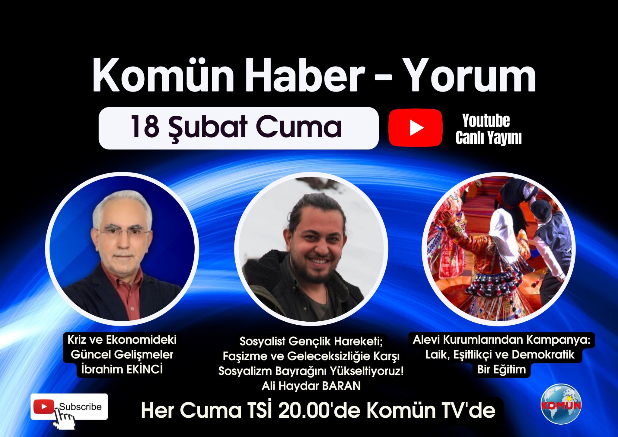Her hafta cuma günleri Komün TV’de yayınlanan Komün Haber-Yorum’da yine bir hafta boyunca öne çıkan gelişmelerin ele alınacağı programa bu hafta Yazar İbrahim Ekinci ve Sosyalist Gençlik Hareketi (SGH) adına Ali Haydar Baran katılacak.