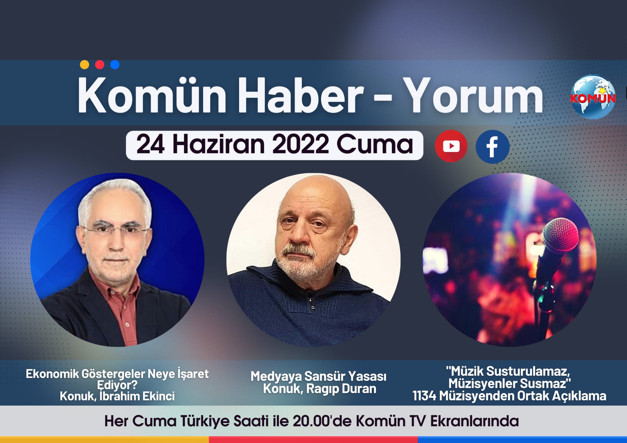 Her hafta cuma günleri Komün TV’de yayınlanan Komün Haber-Yorum’da hafta boyunca öne çıkan gelişmeler ele alınacak. Programa bu hafta Ekonomik Göstergeler Neye İşaret Ediyor” konusu ile Yazar İbrahim Ekinci, “Medyada Sansür Yasası”nı değerlendirmek üzere Gazeteci Ragıp Duran katılacak.