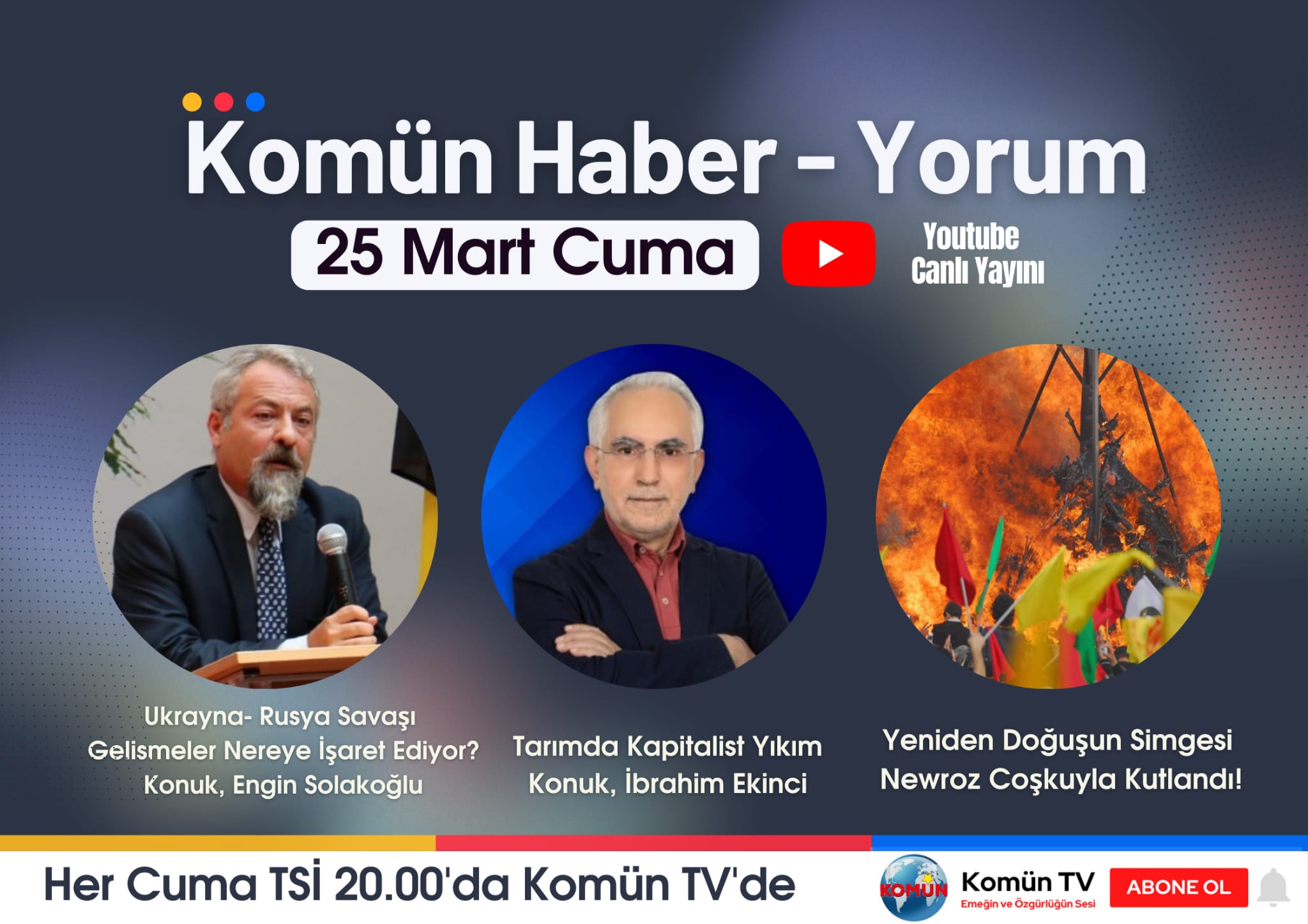 Her hafta cuma günleri Komün TV’de yayınlanan Komün Haber-Yorum’da yine bir hafta boyunca öne çıkan gelişmeler ele alınacak. Programa bu hafta “Tarımda kapitalist yıkım”ı değerlendirmek üzere İbrahim Ekinci ve Ukrayna-Rusya savaşını değerlendirmek üzere Engin Solakoğlu katılacak.