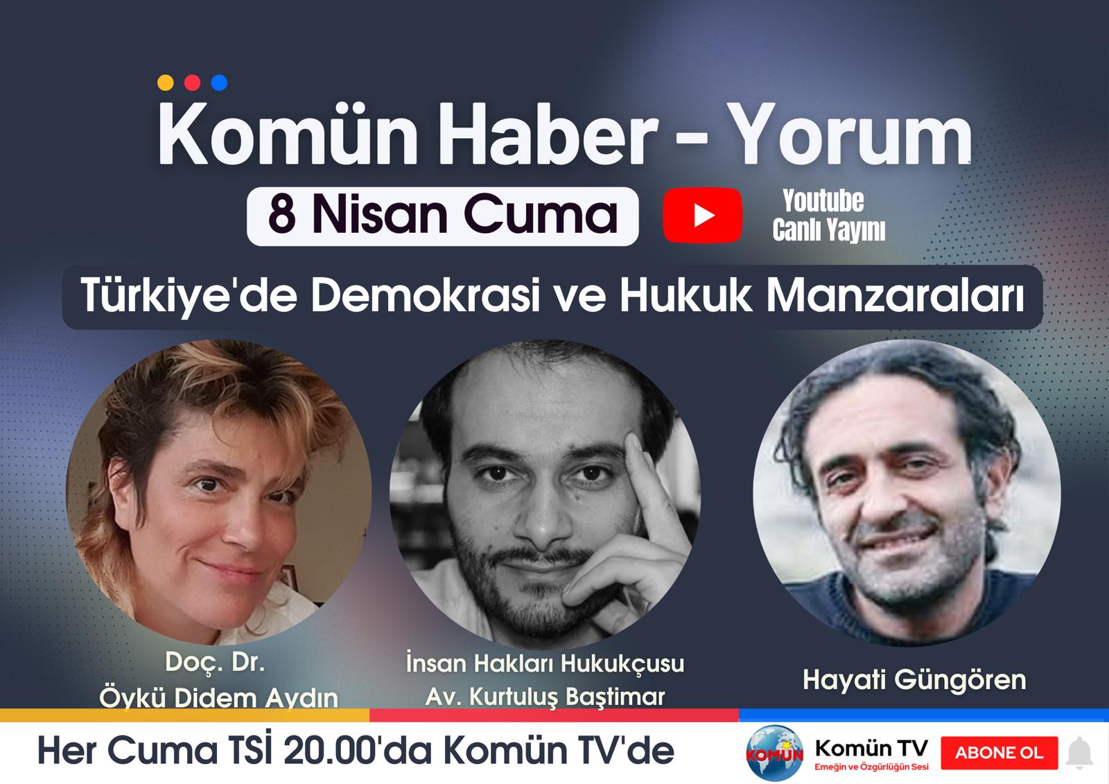 Her hafta cuma günleri Komün TV’de yayınlanan Komün Haber-Yorum’da yine bir hafta boyunca öne çıkan gelişmeler ele alınacak. Programa bu hafta “Türkiye’de Demokrasi ve Hukuk Manzaraları”nı değerlendirmek üzere Hayati Güngören, Doç. Dr. Öykü Didem Aydın ve İnsan Hakları Hukukçusu Av. Kurtuluş Baştimar katılacak.