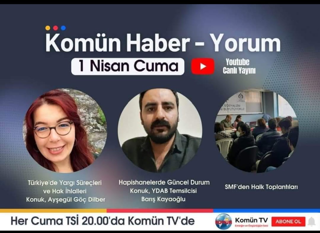 Her hafta cuma günleri Komün TV’de yayınlanan Komün Haber-Yorum’da yine bir hafta boyunca öne çıkan gelişmeler ele alınacak. Programa bu hafta “Hapishanelerde güncel durum”u değerlendirmek üzere Yeni Demokrasi Aileleri Birliği (YDAB) temsilcisi Barış Kayaoğlu ile “Türkiye’de yargı süreçleri ve hak ihlalleri”ni değerlendirmek üzere Ayşegül Göç Dilber katılacak.