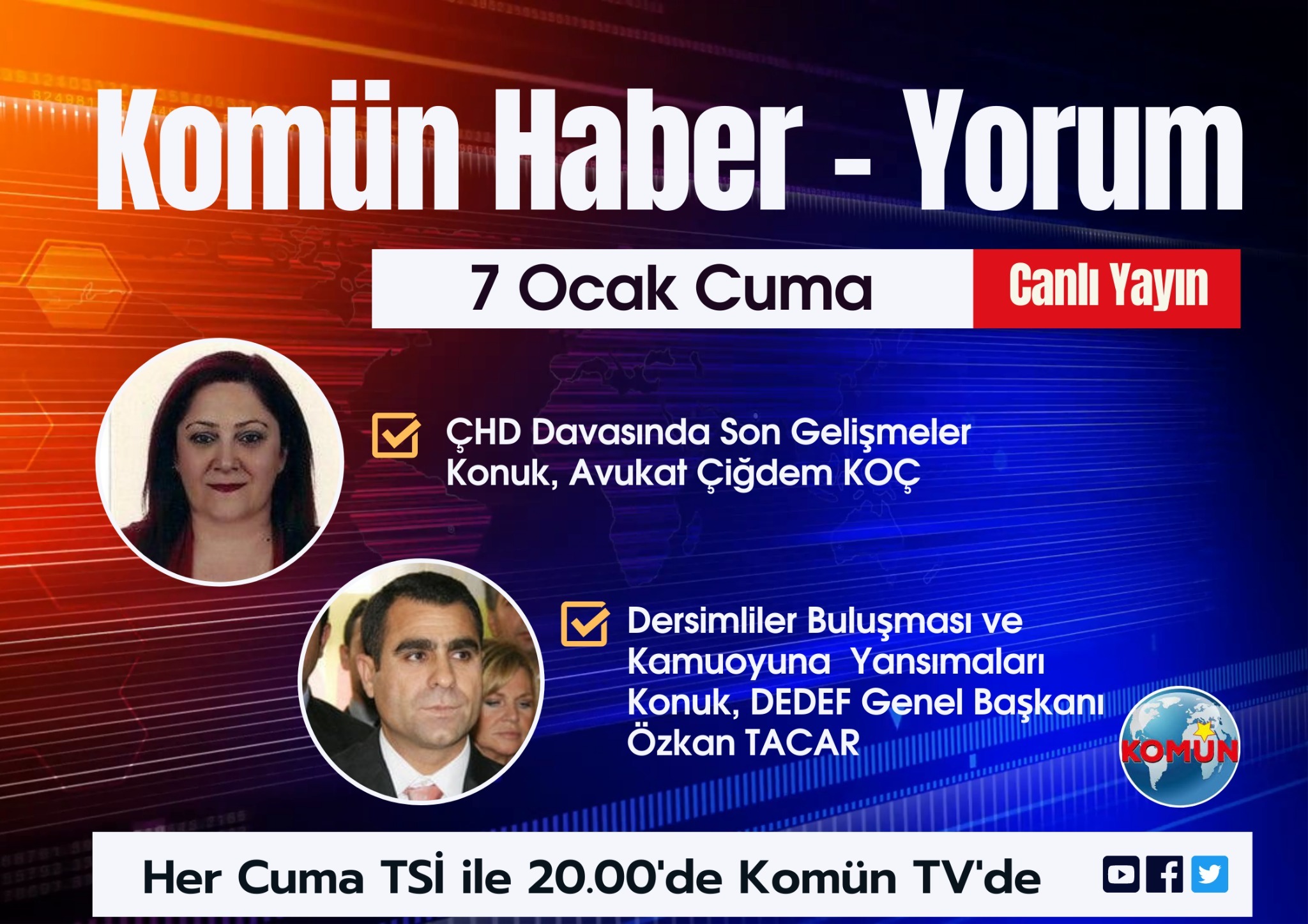 Her Cuma Komün TV’de yayınlanan Komün Haber-Yorum’a bugün Avukat Çiğdem Koç ve Dersim Dernekleri Federasyonu (DEDEF) Genel Başkanı Özkan Tacar konuk oluyor.