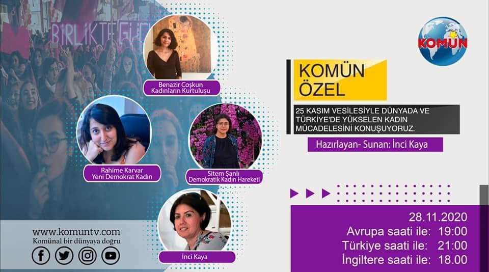 İnci Kaya’nın sunacağı programa; Kadınların Kurtuluşu temsilcisi Benazir Coşkun, Demokratik Kadın Hareketi temsilcisi Sitem Şanlı, Yeni Demokrat Kadın temsilcisi Rahime Karvar katılacak.  Programa 28 Kasım Cumartesi günü TSİ 21.00’da Komün TV sosyal medya hesaplarından erişebilirsiniz.