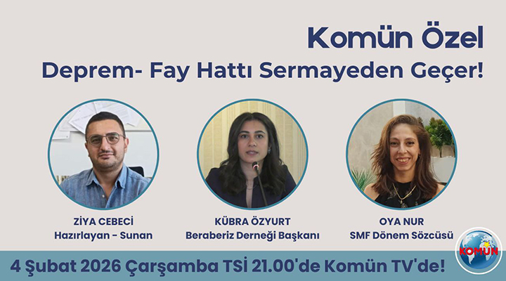 Komün TV’de yayınlanan Komün Özel programı, yarın akşam “Deprem-Fay Hattı Sermayeden Geçer!” başlığıyla izleyiciyle buluşacak. Program 4 Şubat Çarşamba günü saat 21.00’de ekrana gelecek.