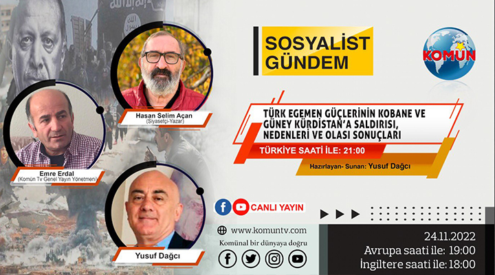 Komün TV’de yayınlanmaya devam eden Sosyalist Gündem programı, “Türk Egemen Güçleri’nin Kobane ve Güney Kürdistan’a Saldırısı, Nedenleri ve Olasılıkları” konusuyla izleyici karşısına çıkıyor.