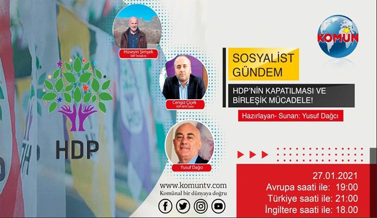 Komün TV’de yayınlanan Sosyalist Gündem programının bu seferki konusu ”HDP’nin kapatılması ve Birleşik Mücadele” olacak. Yusuf Dağcı’nın hazırlayıp sunduğu programda HDP’nin kapatılma girişimleri bağlamında güncel siyasal gelişmeler ve birleşik mücadele tartışılacak.