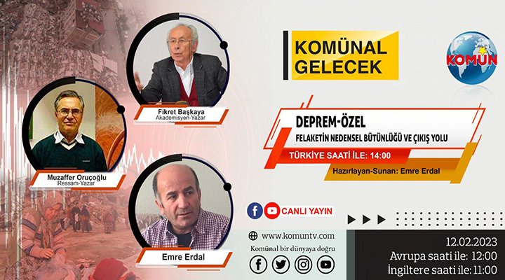 Emre Erdal’ın hazırlayıp sunduğu Komünal Gelecek “Deprem Özel” programı bu hafta “Felaketin Nedensel Bütünlüğü ve Çıkış Yolu” konu başlığıyla izleyici karşısına çıkıyor. Programa, Akademisyen-Yazar Fikret Başkaya ve Ressam-Yazar Muzaffer Oruçoğlu katılacak.