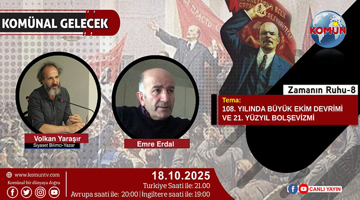 Emre Erdal’ın hazırlayıp sunduğu Komünal Gelecek program serisi, yeni bölümüyle izleyiciyle buluşuyor. “Zamanın Ruhu” başlığıyla yayınlanan serinin sekizinci bölümü, bu akşam “108. Yılında Büyük Ekim Devrimi ve 21. Yüzyıl Bolşevizmi” konusunu ele alacak.