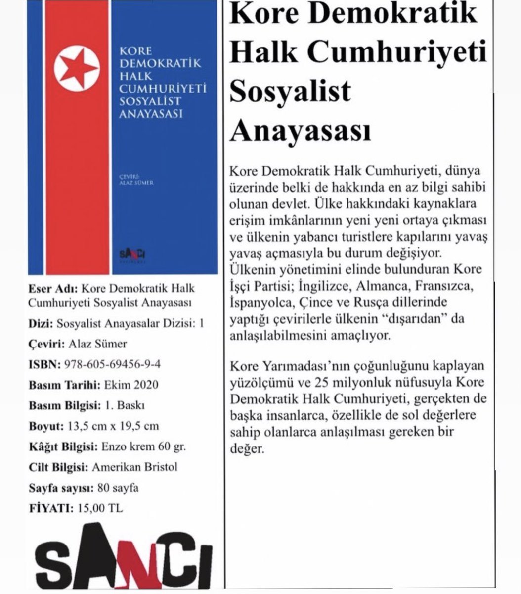 Sancı Yayınları’nın Sosyalist Anayasalar Dizisi’nin ilk eseri Kore Demokratik Halk Cumhuriyeti Anayası Alaz Sümer’in çevirisiyle yayımlandı.