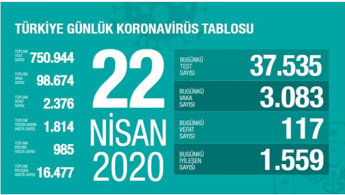 Koca, “Bugün 37 bin 535 yeni testin sonucunu aldık. Bu sonuçlara göre 3 bin 83 yeni hasta tespit edildi. Yani bugün düne göre önemli oranda hasta sayısının düştüğünü görüyoruz. Toplam vaka sayımız 98 bin 674’e ulaştı. Son 24 saat içinde 117 hastamızı kaybettik. Gelmesini en çok umut ettiğimiz günler hiç vefat haberi vermeyeceğimiz günlerdir. Yoğun bakımdaki hasta sayımız bugün 1814. Bunların 985’inin solunumu yapay yolla sağlanıyor. Hem yoğun bakım hastalarımızda hem de entübe hastalarımızda belirgin azalma görülmüştür. Hastalığı yenen 1559 vatandaşımızla birlikte iyileşen hasta sayımız 16 bin 477’ye ulaştı” dedi.