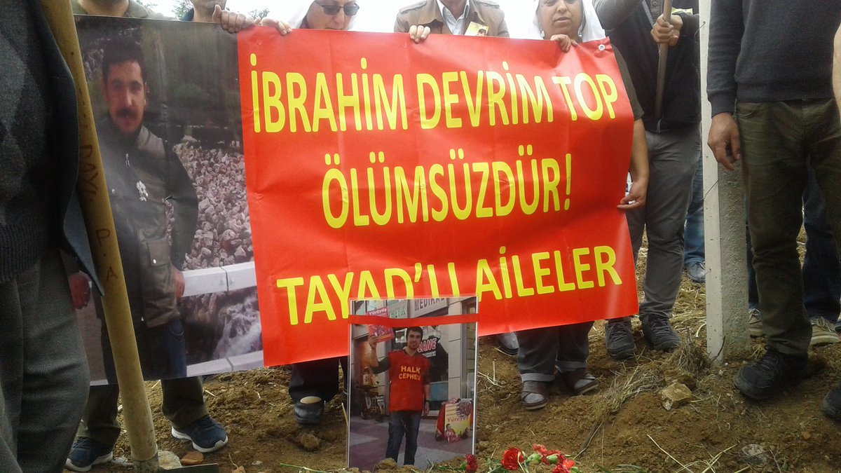 Mezarlıkta “İbrahim Devrim Top ölümsüzdür!” pankartını açan TAYAD’lı aileler “Bize ölüm yok” marşını söyledi.