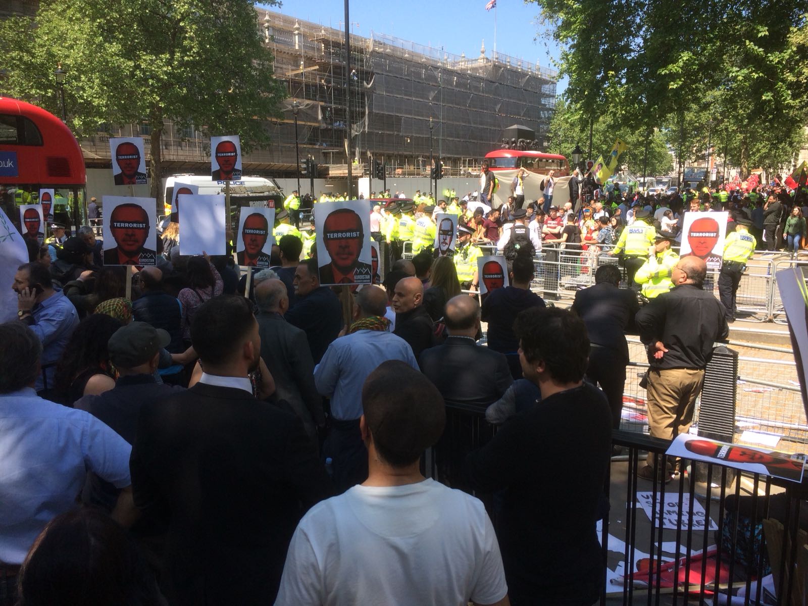 Cumhurbaşkanı Tayyip Erdoğan ve İngiltere Başbakanı Theresa May görüşmesinden önce İngiltere başbakanlık binasının bulunduğu Downing Sokağı’nda toplanan kitle Erdoğan’ı protesto etti.