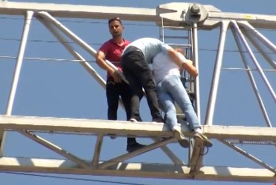 Dolapdere’de çalıştıkları rezidans inşaatında maaşlarını alamadıkları belirtilen 5 işçi rezidans inşaatında kullanılan vince çıktı. Burada bir süre bekleyen işçilerden biri rahatsızlandı. Arkadaşının rahatsızlandığını fark eden bir işçi, aşağı düşerken son anda tuttu.