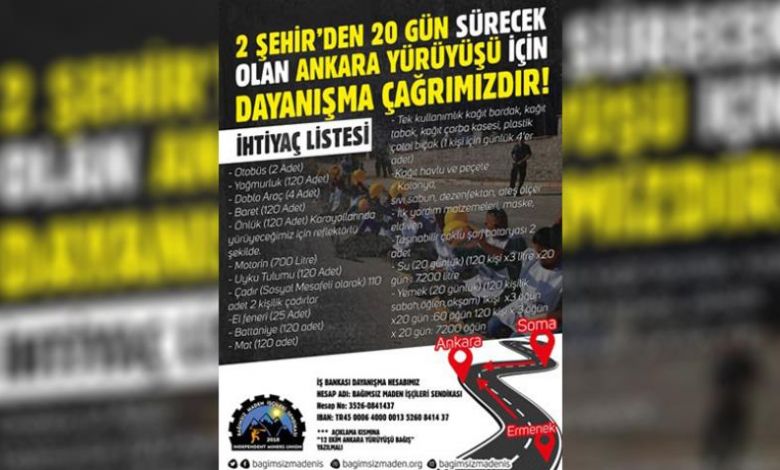 Madenciler 12 Ekim’de Soma’dan Ankara’ya doğru yola çıkacak, Soma Katliamı’nda katledilen 301 işçinin her biri için 1 kilometre yürünerek 20 gün sürmesi planlanıyor.