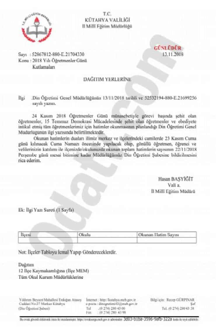 Milli Eğitim Bakanlığı (MEB) tüm okullara bir yazı göndererek, 24 Kasım Öğretmenler Günü’nde hatim okunmasını istedi.