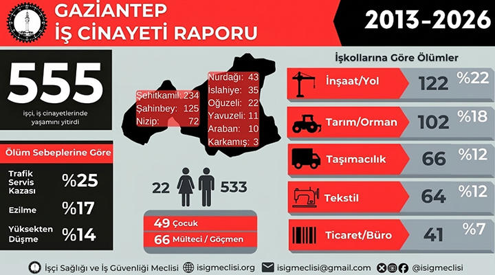 Rapora göre Antep’te son 13 yılda en az 555 işçi çalışırken hayatını kaybetti.