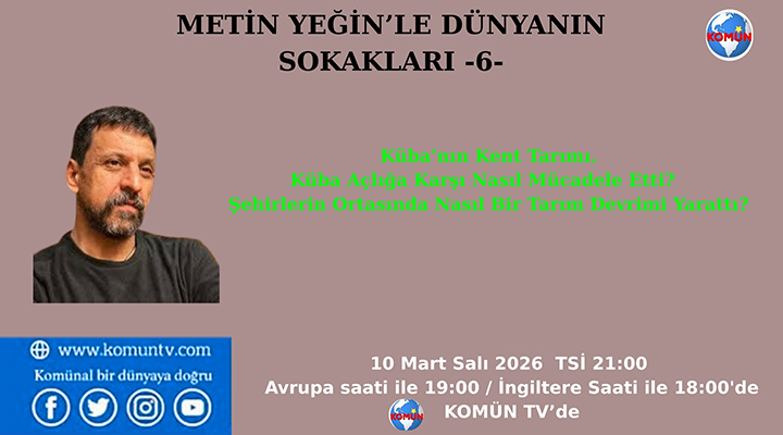 Komün TV’de yayınlanan, Metin Yeğin’in sunumuyla hazırlanan “Dünyanın Sokakları” programının bu haftaki bölümünde Küba’nın kent tarımı deneyimi mercek altına alınıyor. Programda, Küba’nın açlığa karşı geliştirdiği mücadele yöntemleri ve şehirlerin ortasında ortaya çıkan tarım pratiğinin nasıl bir toplumsal dönüşüm yarattığı ele alınıyor.
