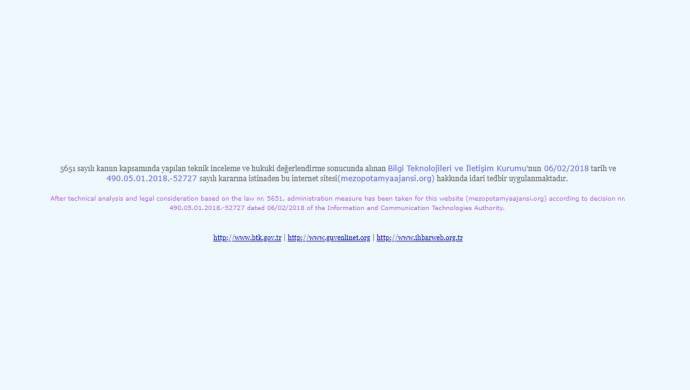 Erişim engelinde şu ifadeler kullanıldı: “5651 sayılı kanun kapsamında yapılan teknik inceleme ve hukuki değerlendirme sonucunda alınan Bilgi Teknolojileri ve İletişim Kurumu’nun 06/02/2018 tarih ve 490.05.01.2018.-52727 sayılı kararına istinaden bu internet sitesi (mezopotamyaajansi.org) hakkında idari tedbir uygulanmaktadır.”
