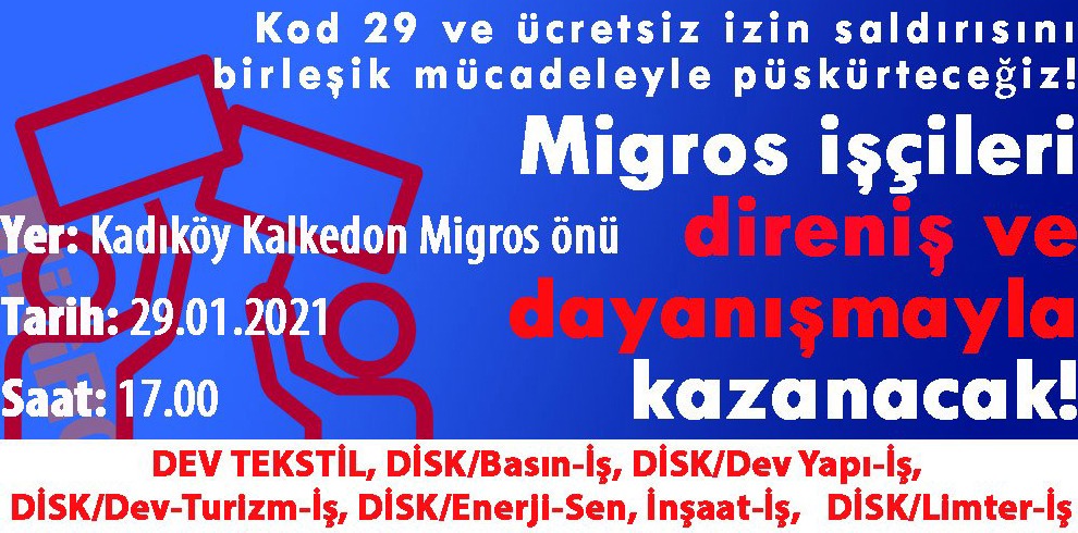 DEV TEKSTİL, İnşaat-İş, DİSK/Basın-İş, DİSK/Dev Yapı-İş, DİSK/Dev-Turizm-İş, DİSK/Enerji-Sen, DİSK/Limter-İş sendikaları Migros işçilerinin direnişiyle dayanışmak için 29 Ocak’ta Kod 29 ve ücretsiz izin saldırılarına karşı yapacakları eyleme çağrı yaptılar.