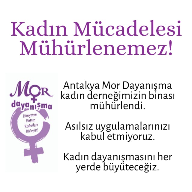 “Kadın mücadelesi mühürlenemez! Antakya mor dayanışma kadın derneğimizin binası mühürlendi. Asılsız uygulamalarınızı kabul etmiyoruz. Kadınlar için eşit ve özgür bir dünya kurulana kadar nerde olursa olsun mücadeleden vazgeçmeyeceğiz.”