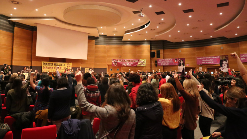 Birçok kentten çok sayıda kadın mor renkli kıyafetleri ve aksesuarlarıyla konferansa katılırken, sık sık “Yaşasın Kadın Dayanışması”, “İnadına mücadele inadına özgürlük” sloganları atılarak, halay çekildi.