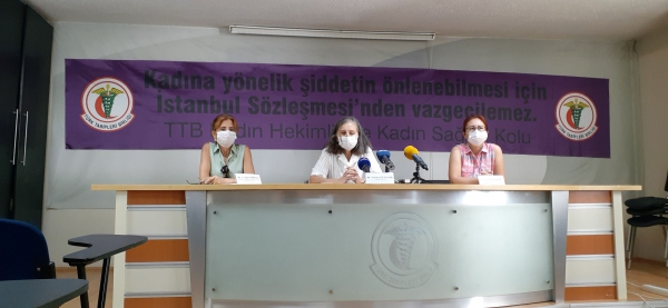 Türk Tabipleri Birliği (TTB) ile TTB Kadın Hekimlik ve Kadın Sağlığı Kolu kadına yönelik şiddete ve İstanbul Sözleşmesi’nin tartışmaya açılmasına ilişkin basın toplantısı düzenledi. TTB Merkez binasında yapılan açıklamada konuşan TTB Merkez Konsey Üyesi Selma Güngör, “Mücadelemizle elde ettiğimiz haklarımızdan vazgeçmiyoruz, vazgeçmeyeceğiz. İstanbul Sözleşmesi’nden çekilmenin sonuçları korkunç olacaktır” diyerek sözleşmenin bir an önce uygulanması talebinde bulundu. Toplantıya Ankara Tabip Odası Yönetim Kurulu Üyesi Gülgün Kıran ve TTB Kadın Hekimlik ve Kadın Sağlığı Kolu Üyesi Ayşe Uğurlu da katıldı. Kadına yönelik şiddete karşı çıkarken hayatını kaybeden Dr. Aynur Dağdemir’e adanan basın açılaması metni, TTB Merkez Konseyi Üyesi Selma Güngör tarafından okundu.