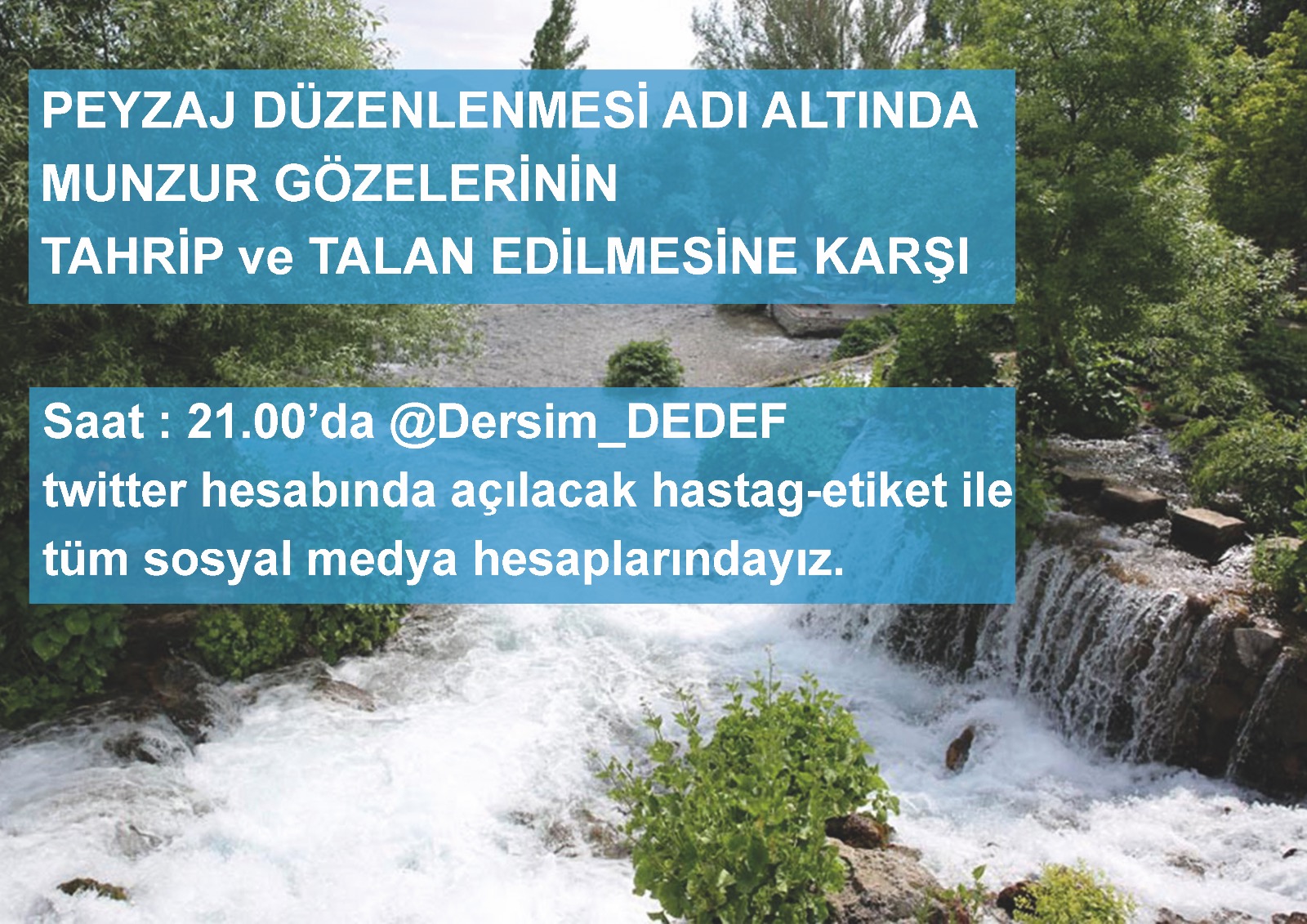 ‘Peyzaj Düzenlemesi Adı Altında Munzur Gözelerinin Tahrip ve Talan Edilmesini hep birlikte durduralım. İnanç merkezimiz olan Munzur Gözelerinde hayata geçirilmeye çalışılan Peyzaj Projesi inancımıza, kültürümüze ve hafızamıza müdahale ile eş değerdir.