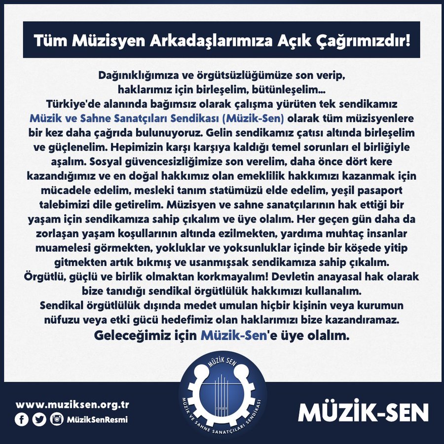 Müzisyenlere yönelik “Gelin sendikamız çatısı altında birleşelim ve güçlenelim” çağrısının yapıldığı paylaşımda şu ifadelere yer verildi: