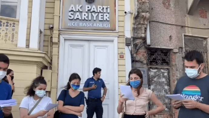 Boğaziçi Üniversitesi öğrencileri, AKP’li Cumhurbaşkanı Tayyip Erdoğan tarafından Boğaziçi Üniversitesi’ne Naci İnci’nin “kayyım” rektör olarak atanmasını, AKP Sarıyer ilçe binası önünde protesto etti. Açıklama yapmak isteyen öğrencilere polislerce engellenmek istense de öğrenciler açıklama yaptı.