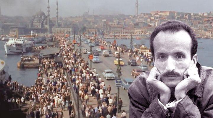 Zaven Biberyan. Fotoğraf: Tilda Mangasar Biberyan Arşivi. / Arka planda İstanbul, 1961 (kolaj).