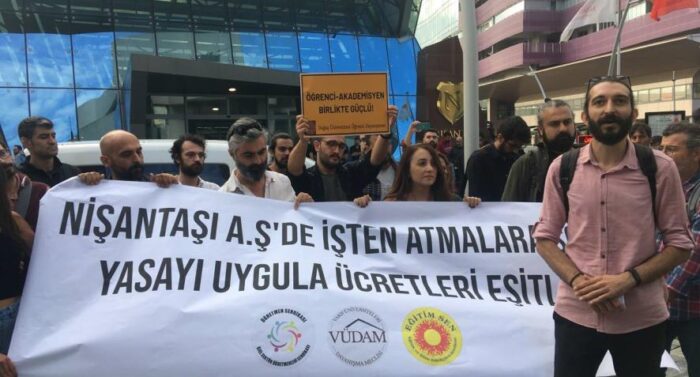 “Geçtiğimiz mart ayında YÖK Kanunu’ndaki düzenlemeye dayanarak, ücret eşitlemesi talebinde bulunan 40’a yakın akademisyeni işten çıkartan Nişantaşı Üniversitesi eksik ücret, baskı, mobbing uygulamalarını ve tek tipleştirme dayatmalarını sürdürmektedir. Akademisyenlerin fiili meşru müdafaası sonucu oluşan kamuoyu baskısıyla nisan ayında 9 vakıf üniversitesine inceleme başlatmak zorunda kalan YÖK ise, hangi üniversitelere hangi yaptırımları uygulandığı bilgisini gizli tutarak bu haksız uygulamalara ortak olmaktadır.