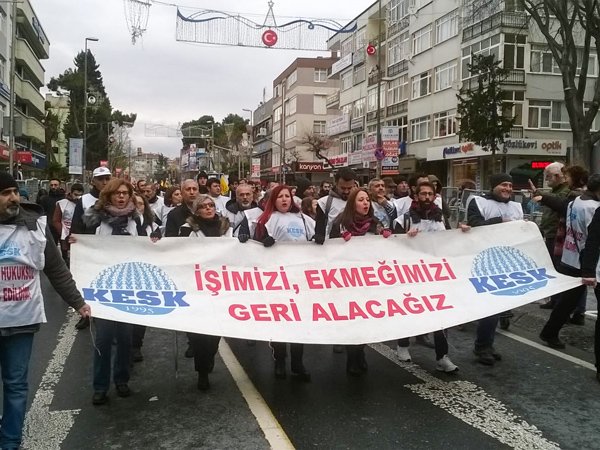 “Taşeron düzenlemesi Meclis’ten kaçırıldı, KHK’yla düzenlendi. İşçilere haklarından, alacaklarından vazgeçmeleri dayatıldı. Toplu sözleşme hakkımız gasp edildi. Kamu çalışanları masalarda, saraylardan gelen tek bir emirle satıldı. Savaşa ayrılan paydan emekçiye pay kalmadı. Emeğimizle yarattığımız değerler emperyalistlere peş keş çekildi.